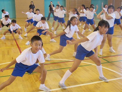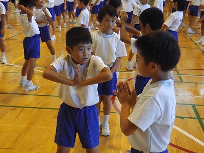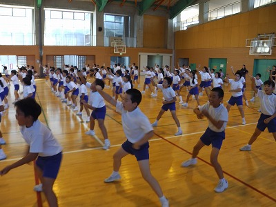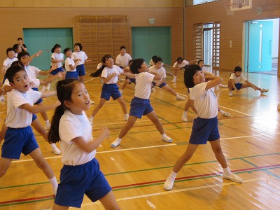 3年生は初めてなので,動きを覚えることに苦労していました。でも、4年生が手取り足取りで教えている姿がたくさん見られ、少しずつ上手になってきました。