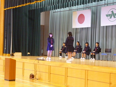 児童集会では、1月25日に行われる英語スピーチコンテストの代表者による校内発表がありました。本番までに練習を重ね、100%の力を出し切れるようにしてほしいですね。