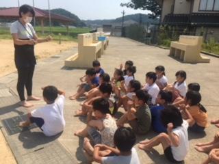 1年生が、さつまいもの大きく伸びた蔓を持ち上げ、五感を働かせて観察していました。国語科で学習した大きさ・色・形・触った感じ・においなどの観察の観点を使って観察する力は、次学年の学習にもつながります。猛暑の中でしたが、さつまいもの成長を感じながら楽しく観察していました。