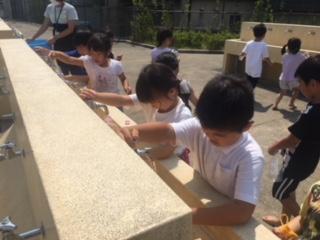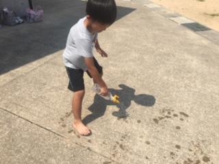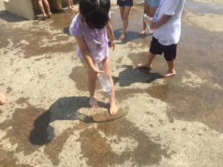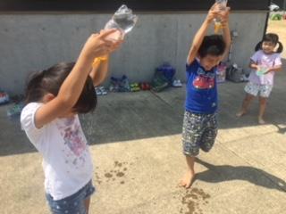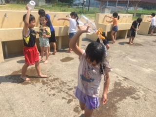 蒸し暑い今週、1年生は、生活科の時間を使って水遊びを楽しみました。着替えを持参して登校したので、全身水を浴びても大丈夫!水を撒いて絵を描いたり、滝に打たれるように思いっきり水を浴びたりしながら、暑い夏を楽しみました。