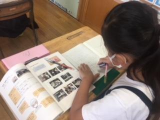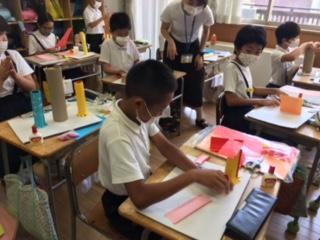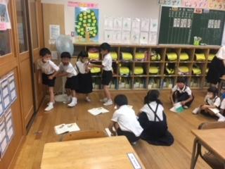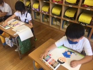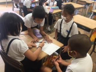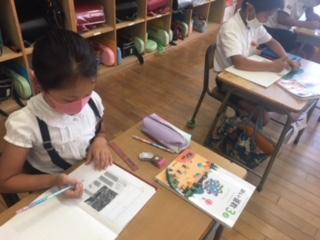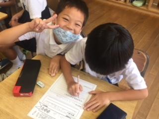 16日間の短い夏休みでしたが、1年生にとっては小学校初めての夏休み。それぞれ楽しかったことを思い出しながら、嬉しそうに表現していました。1組では作文に書き、3組では絵で表現して、夏の思い出を一生懸命に伝えていました。