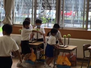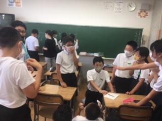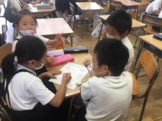 2学期の大きな行事である運動会。今年度は、コロナウイルス感染症拡大防止のため、種目を削減して午前中のみの開催となりますが、6年生にとっては、最後の運動会です。赤・青・黄・緑の4団に分かれて、応援歌や笛・コールのない新しい形の応援の方法を生み出そうと真剣に考えながら話し合っていました。たくさん制限のある中でも、楽しく知恵を出し合い、より良い姿を目指している6年生。思い出に残る運動会にしようと自分たちで行動している6年生。とても頼もしいです。
