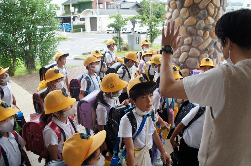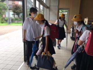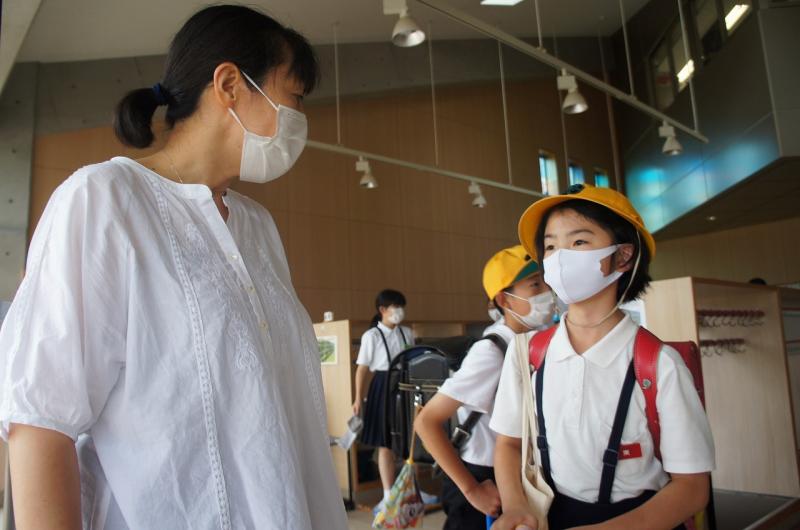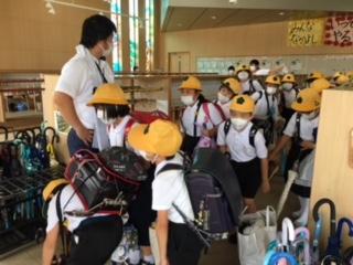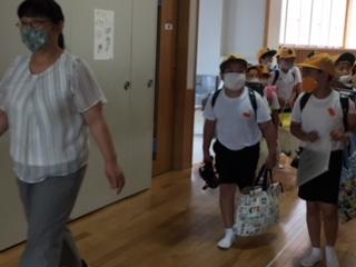 8月7日(金)終業式を終え、いよいよ下校です。津幡小学校では、学期最後の下校は、担任の先生と玄関さよならをして帰ります。子ども達は、玄関で見送る担任に嬉しそうに「さようなら」と大きな声で挨拶して帰りました。制限が多く短い夏休みですが、安全で楽しい夏休みを過ごしてほしいと、担任の先生方も願いを込めて見送っていました。