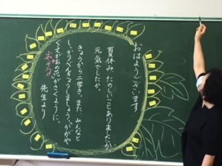 2学期がスタートしました。どのクラスも、先生の思いが込められた黒板メッセージで子ども達を出迎えていました。2学期、やる気を引き出すメッセージに応える子ども達の活躍を期待しています。