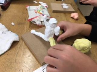 6年2組の子ども達が、図工の時間に、自分がなりたい職業を表すために形や色を工夫しながら、針金と紙粘土を使って作製していました。12年後の自分を想像し、思いを込めて作っていました。