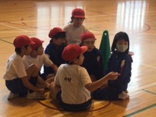 28日(木)2年1組の子ども達が、体育の時間に4チームでボール取りゲームをしていました。まずは、真ん中の円の中のボールを1個ずつ素早く取り、無くなったら他のチームの陣地から1個ずつ奪ってきます。前のゲームで勝ったチームが狙われやすく、ゲームをするたびに勝つチームが変わるので、子ども達はやる気満々で頑張っていました。