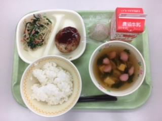 29日(金)【金沢献立】白ご飯・蓮根入りハンバーグ・小松菜の胡麻和え・花麩のすまし汁・加賀棒茶まんじゅう