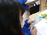 4年生は算数で「広さ比べ」の学習です。始めは重ねたり、枚数を数えたりして広さを比べます。