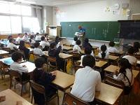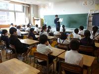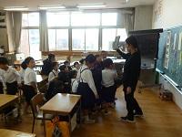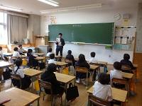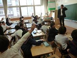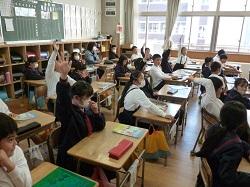 3年生は外国語の学習です。アンジェロ先生に対して、多くの児童が進んで自己紹介をしてい