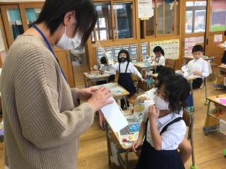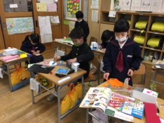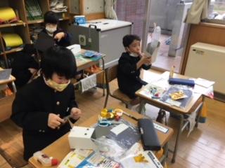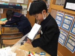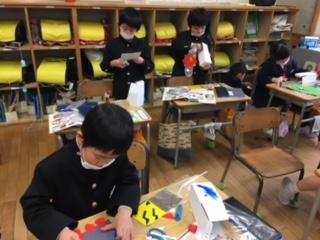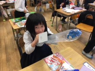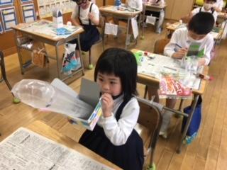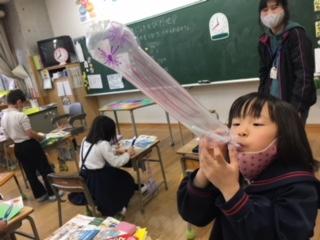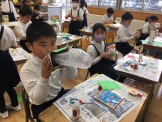 2日(火)1年生の子ども達が、図工の時間におもちゃを作っていました。息を吹き込むと膨らむ仕組みを使った楽しいおもちゃです。かわいい顔や花火が飛び出す工夫をしながら、楽しみながら作っていました。