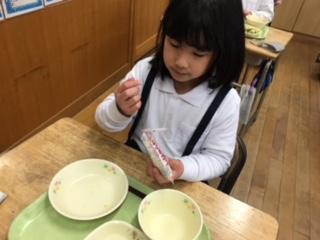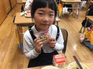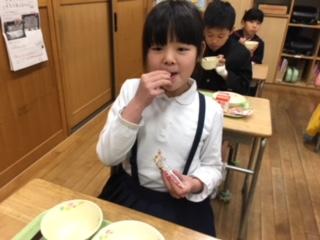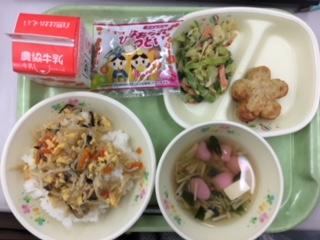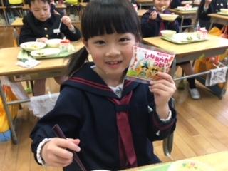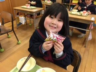 明日3月3日は、桃の節句。日本では、女の子の健やかな成長を祈る節句の年中行事として、幸福を願いながら行います。学校では、米飯給食の今日2日(火)「ちらしずし・花形豆腐ハンバーグ・菜の花のごま和え・あさりのすまし汁・ひなあられ」のひな祭り献立で、1日早くお祝いしました。子ども達は、ちらしずしなどを美味しくいただいた後、ひなあられを嬉しそうに食べていました。