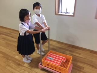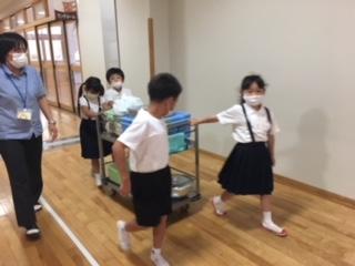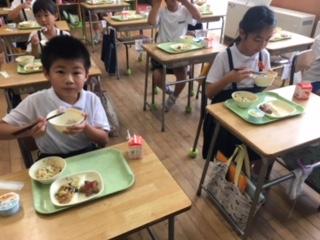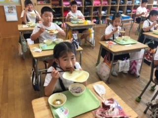 7月7日(火)今日は七夕。給食も七夕献立で、星のハンバーグと星空をイメージした冷や麦に七夕デザートも付きました。給食を運ぶ1年生も楽しみにして運び、もちろん食べる時も、どの学年もおいしそうに食べていました。食事中には、放送委員会の子ども達が、「七夕ものがたり」の読み聞かせをしてくれました。