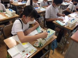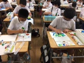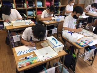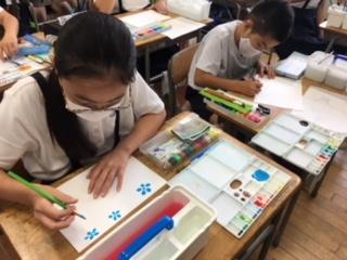 7月6日(月)6年生が、図画工作の時間に『筆あと研究所』の学習に取り組んでいました。美術作品の表現の工夫の一つである「筆あと」の特徴から、作者の表現の意図や思いをとらえ、自分なりのイメージをもって作品を作る学習です。4つの作品からとらえた「筆あと」の中から自分の好きな技法を選び、筆や自分の指を使ってそれぞれの作品を楽しく作っていました。