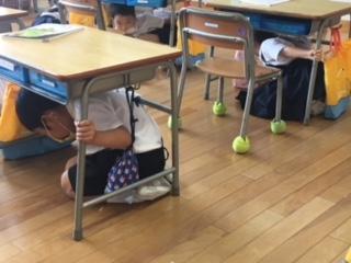 東日本大震災以来一人ひとりの身の安全を守る行動である「自助」の重要性が認識されたことから、石川県で実施されている「県民一斉防災訓練(シェイクアウトいしかわ)」。本校でも、約1分間の「安全行動」に毎年取り組んでいます。どの学年の子ども達も、地震の効果音が鳴った後「しゃがむ・かくれる・じっとする」といった行動をとり、真剣な表情で訓練を行っていました。初めて取り組んだ1年生も、机の脚をしっかりと持ち、とても上手にできていました。今回のように予告なしの訓練を行うことで、実践的な力をつけていきたいと思います。