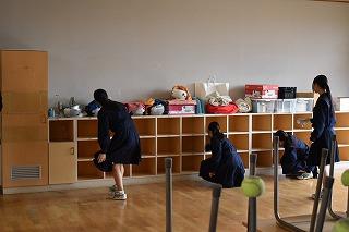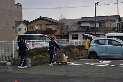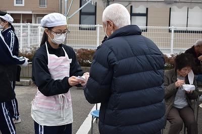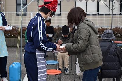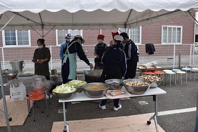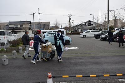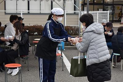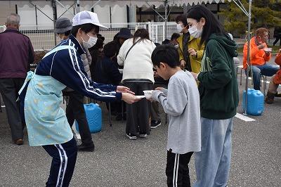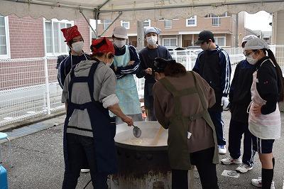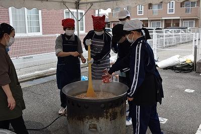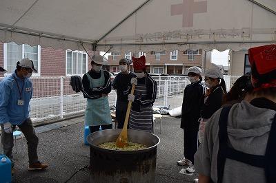 参加した生徒会役員の皆さんは、9時半前から本校調理師、調理員さんの手ほどきを受けながら、大鍋で「めった汁」を調理しました。10時過ぎからは、支援物資を受け取った方々等が訪れ、子供たちは、「熱いので気を付けてください」と声をかけながら、豚汁を手渡しました。子供たちは、おもてなしの気持ちをもって、最後まで丁寧に、訪れた方々に接客しました。炊き出しだけでなく、駐車場までの物資運搬もお手伝いしました。