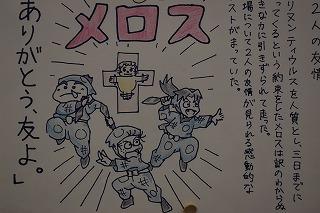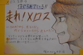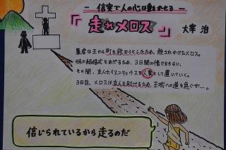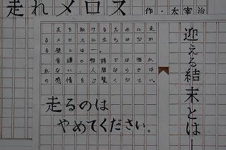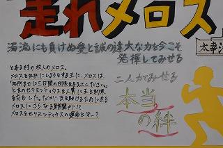 2年生各クラス教室前の掲示板に、国語科の授業で制作した「走れメロス」のポップが展示されています。人の目を引くデザインとインパクトのあるキャッチコピー、「おっ!これは!」と目がPOPをキャッチするように工夫された作品が並んでいます。