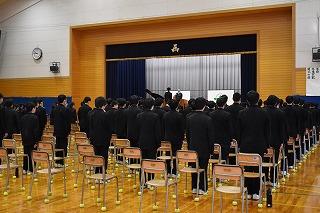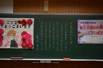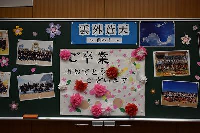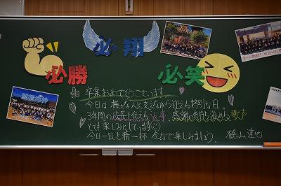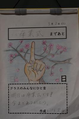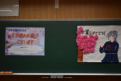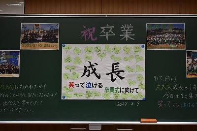 3年生の皆さん、明日は「凛とした姿」、卒業証書授与での「担任の先生方の思いに応える返事」、「3年間の思いを込めた校歌、卒業の歌の歌声」で今まで支えてくれた家族、先生方への感謝の気持ちを表し、みんなで「最高のフィナーレ」を迎えようね。