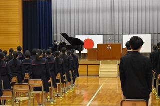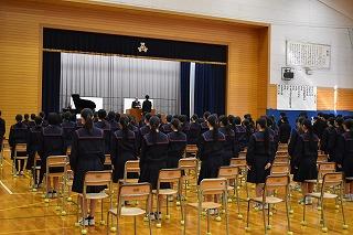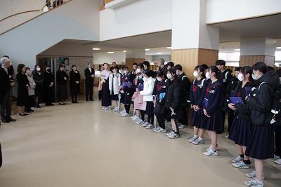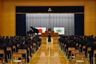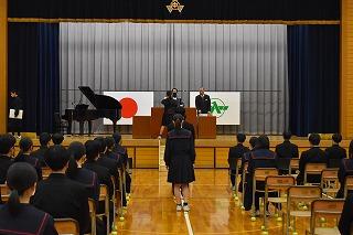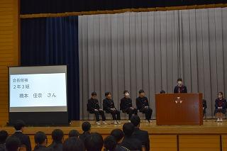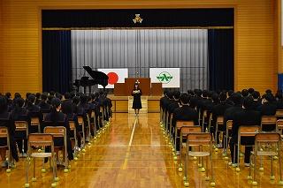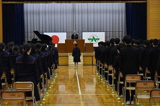 答辞は、卒業生を代表して北口美羽さんが務めました。部活動、運動会、文化祭などの3年間のかけがえのないたくさんの思い出を振り返るとともに、先生方、家族、友への感謝を、気持ちを込めて綴ってくれました。答辞の中にあった「こうして過ごしていることは当たり前ではなく奇跡の毎日」、私たちはこの言葉をしっかりと胸に刻み、前に向かって、未来という空に向かって、歩みを進めていきましょう。