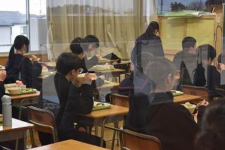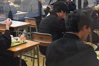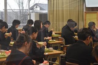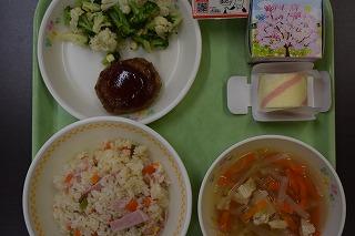 3年生にとっては、今日が中学校生活最後の給食。明日が卒業式ということで、今日の給食は卒業お祝い献立でした。メニューはハムピラフ、ハンバーグ、花野菜サラダ、コンソメジュリアン、デザート(お祝いケーキ)でした。3年間、いつも美味しくて栄養満点の給食をいただくことができた皆さんは本当に幸せですね。3年間、お世話になった調理師、調理員の皆さん、栄養教諭の先生に、感謝の気持ちをもって、最後の給食を味わってください。調理師、調理員の皆さん、山田先生、今週も美味しくて栄養満点の給食をありがとうございました。来週もよろしくお願いします。
