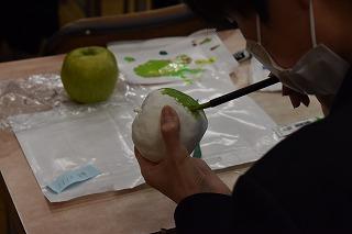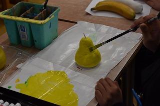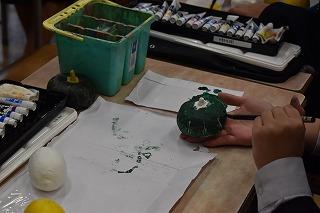 1年美授科の授業。粘土を使って野菜、果物作りに励んでいます。形状や質感は細部にまでこだわり、それに色を重ねていくと色鮮やかな野菜が完成です。「ほんもの」そっくりの「にせもの」の数々です。
