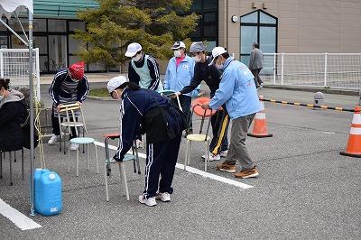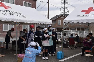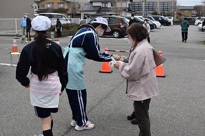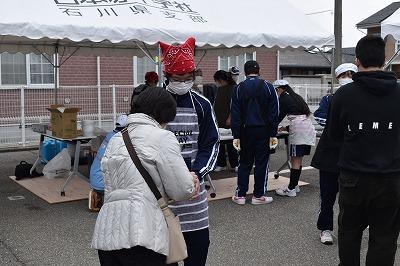 本日、津幡町雛者支援のための炊き出しが、津幡町社会福祉協議会正面駐車場にて行われ、本校新生徒会役員の皆さんが、津幡町赤十字奉仕団の一員として活動に参加しました。