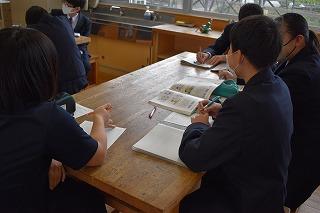 1年生理科の授業。授業におじゃますると、みんなの机の上には、なにやらかたまりが1つずつ。かたまりの中には化石のようなものが・・・。これらは、授業担当の鶴山先生が息子さんらと一緒に、石川県金沢市から富山県小矢部市にかけて分布する大桑層(おんまそう)という地層から採取してきたものです。大桑層は、新生代第四紀(2000万年前)の地層だそうです。化石に関する知識をおさらいして、いざ地層に埋もれている化石の発掘作業です。生徒たちは一心不乱に、ようじ等を使って地層に埋もれている化石を取り出していました。物言わぬ化石たちは、皆さんに何を語りかけているのでしょうか? なにかロマンを感じますね。