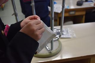 2年生技術家庭科家庭分野の授業。現在、裁縫の学習中。今日は、表面に目立たたないように、まつり縫いができるようになることを目標に、一人一人チャレンジしていました。私も中学生時代に、授業でまつり縫いを習ったと記憶していますが、今はできるか自信がありません。生徒の皆さんは、上手に針を動かしていました。