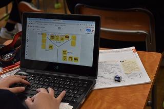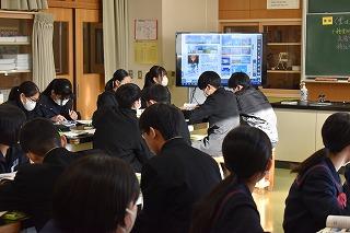 3年生理科の授業。生態系について学習中のようです。既習事項の食物連鎖、食物系図を確認し、「ある動物が一時的に増えても生態系のバランスは保たれる。どんな過程を経て、バランスを保つのか」「どのようなときに生態系は崩壊すると考えられるか」について、個人、グループで考察していました。最後に、ニホンオオカミの絶滅によってどのような問題が起きているかについて考え、考察での知識・技能が活用できるか確認しました。