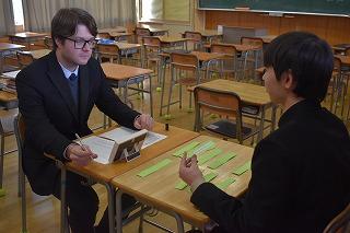 3年生英語科の授業。話すこと【やり取り】のパフォーマンステストを行っていました。各自が選択したトピックについて、3年間の英語の授業で学んだ知識・技能を総動員して、アンジェロ先生とのやり取りにチャレンジしていました。自分の考えを臆することなく伝えていく気持ちを、これからも大切にしていってくださいね。