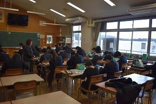 昨日6日(火)の午後、県・町の教育委員会の方3名が来校され、授業の様子等を参観されました。この方々は、9月に行われた学校訪問時にも来校されています。授業参観後の懇談で、「2年生は、一人一人が前向きに授業に向かう姿が見られ、9月に比べると、大変落ち着いた雰囲気の中で授業が進められている、また学習内容に関する積極的な発言も増えた」との言葉をいただきました。大変うれしい気持ちです。先日の全校集会や学校だよりでも、2年生には、「最高学年の自覚と誇り」を持ち、今年度を締めくっくてほしいと伝えました。学習用具の準備も含めて、授業に前向きに取り組むことは、自分自身を大切にすることです。そして、2年生プログラム委員が提案した「聞くこと三カ条」にもあるように、仲間の発言にしっかりと耳を傾け、相手の考えを受け止めることは、伝える側の安心感につながる、つまり相手を大切にすることです。授業においても、その他の学校生活の様々な場面においても、他者への気配り、思いやりを忘れず、行動や言葉に表していきましょう。「他人の欠点を笑ってばかりいるのは、臆病の証拠である。(トマス・ホッブス・哲学者)」