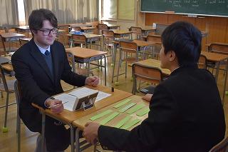 3年生英語科の授業。話すこと【やり取り】のパフォーマンステストを行っていました。各自が選択したトピックについて、3年間の英語の授業で学んだ知識・技能を総動員して、アンジェロ先生とのやり取りにチャレンジしていました。自分の考えを臆することなく伝えていく気持ちを、これからも大切にしていってくださいね。