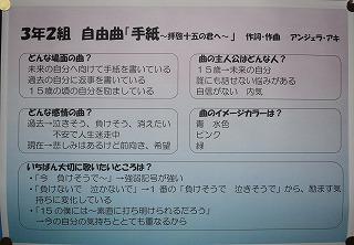 音楽室前の廊下に、合唱コンクールでの各クラスの「自由曲紹介」が掲示されています。「どんな場面の曲か」「どんな感情の曲か」「曲のイメージカラーは」「一番大切に歌いたいところ」などが書かれています。みんなで創り上げるハーモニーがどのようなものになるのか、合唱コンクール本番を楽しみにしています。