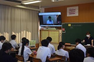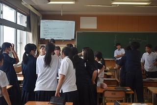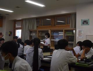 1年生英語科の授業。今日は、夏休みの思い出を伝え合うようです。授業にお邪魔したときは、アンジェロ先生が自身の夏の思い出を伝えているところでした。生徒の皆さんは、グループで机を合わせ、アンジェロ先生の夏の思い出をメモを取りながら聞き、グループで情報共有、全体での確認と進みました。この夏、アンジェロ先生は上谷先生と一緒に白山に登ったのですね。