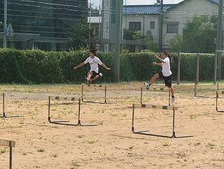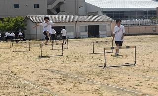 2年生の保健体育科の授業では、陸上競技のハードル走に取り組み始めています。走りながら障害を越える、ハードル間の歩数を合わせるなど、ハードル走はなかなか難しい種目ですね。