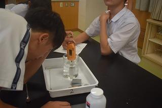 3年生理科の授業。現在、浮力について学習中です。今日の課題は、「浮力の大きさは何によって決まるのか」。水深、物質の種類、体積の大きさなど、各班が立てた浮力の大きさが決まると予想した条件を確認するための実験を行い、浮力の大きさの決定条件について迫りました。