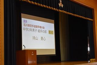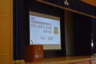 表彰披露を受けた皆さん、おめでとうございます。次の活躍を楽しみにしています。なお、写真にはありませんが、石川県中学校テニス選手権大会男子ダブルスにて、板坂翼さん、中村謙心さんが優勝しています。ご報告します。