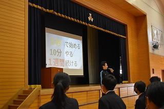 学習については、担当の鶴山先生より、「5秒、10分、1週間」の数字を生徒の皆さんに示しながら、やる気の出し方や方学習を継続することの大切さについて話がありました。