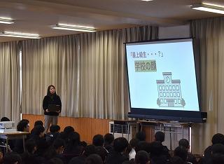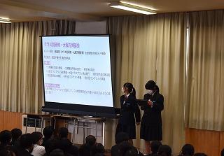 最初は、修学旅行についてでした。5月の修学旅行に向けて実行委員会が発足されており、今日は、実行委員一人一人のあいさつと、各部会【総務部会、生活部会、京都班別自主プラン部会、万博・クラス別研修部会】の内容説明、そして修学旅行のスローガンが発表されました。
