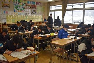 1年生は本日放課後、学年末テストに向けて放課後質問教室を行っていました。「学び合い」コースと「一人自習」コースに分かれて、取り組んでいました。どちらのコースもたくさんの生徒の皆さんが参加していて、テストへの意気込みを感じました。質問教室は明日21日(金)も行われます。