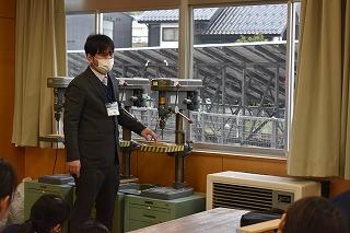 1年生技術家庭科技術分野の授業。椅子の製作に取り組んでいます。今日は穴あけと接合の工程のようです。各自が作業に入る前に、穴あけのポイントや安全に配慮した工具の使い方などについて、先生より実演を交えながらの説明がありました。今日は、生徒の皆さんの実際の作業の様子は見ることはできませんでしたが、安全に配慮しながら、ていねいな作業で、完成に近づいていってくださいね。
