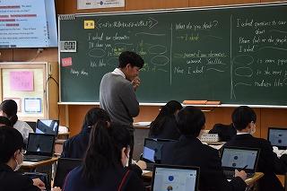 2年生英語科の授業。現在学習しているUnitは、「身近なトピックを通して、調査や発表の方法を考え、身近なことについて調査した内容を、特徴を比較しながら説明することができる」がゴールです。生徒たちは、各自が調査したい身近なトピックを選択、調査を終え、調査結果の発表に向けて、進行中です。今日は、調査結果を発表している教科書本文などを参考にしながら、自身の発表内容をブラッシュアップしていました。