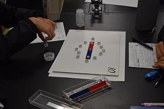 2年生理科の授業。現在、磁界について学習中です。今日は、各グループで、棒磁石の周りに方位磁針を置き、磁界の向きを調べていました。磁石のまわりにいくつかの方位磁針を置くと、それぞれがなにやら決まった方向にN極を向けるようです。方位磁針の向きには、どのような法則があるのでしょうか?