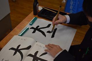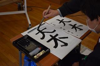 おおぞら学級の授業。1年生と3年生が、書初め練習に励んでいました。1年生は「不言実行」、3年生は「旅立ちの春」です。先生や仲間のアドバイス、手本を参考に何度も筆を走らせていました。