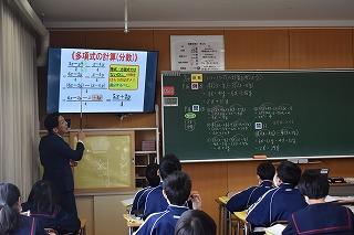 2年生数学の授業。ぴりっとした緊張感のある教室へお邪魔しました。演習問題を終え、多項式の計算(分数)のポイントの確認の場面でした。等式・方程式ではないのに、分母をはらうのはダメ、通分するべし!です。