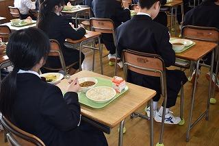 今週最後の給食は、チキンカレー、麦ごはん、ほうれん草オムレツ、海藻サラダでした。カレーライスは、私の大好物です。本当においしかったです。生徒の皆さんの中にも、カレーが大好きという人が多いのではないでしょうか。久しぶりの給食を味わうこと一週間。話に聞いてはいましたが、給食のおいしさに感激です。生徒の皆さんの健康、栄養バランス等に心を配りながら、メニューを考え、調理していただいている調理師、調理員の皆さん、そして栄養教諭の先生に感謝の気持ちを持ちながら、自分の適量を毎日残さずに食べてくださいね。