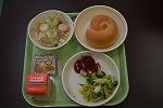 今日のメニューは米粉ミルクロール、お祝い豆腐ハンバーグ、ブロッコリーとコーンのソテー、お祝い紅白スープ、豆腐プリンタルトでした。私自身、おいしさに大感激でした。調理師、調理員の皆さん、1年間どうぞよろしくお願いします。