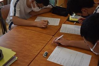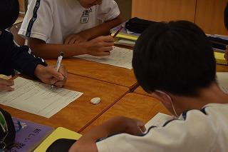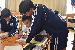 3年生数学科、千木先生の授業。既習の学習内容の定着度を確認するために、入試問題にチャレンジしていました。グループになり、まずは個人で問題にチャレンジ。その後は、各グループで互いの解法を確認したり、答えまで辿り着かなかった仲間にアドバイスしたりしていました。互いに学び合うことで、どのグループも笑顔になっていきました。とっても素敵な光景でした。