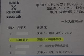 本日放課後に、うれしい知らせを受けました。学校外でアーチェリー競技に取り組んでいる山田周平さん(3年)が、先週末に行われた「第2回インドカップ in KUROBE アーチェリー大会」で2位に入賞しました。この大会は一般の方や高校生も参加しており、その中で中学生として2位は、大変立派だと思います。おめでとうございます。
