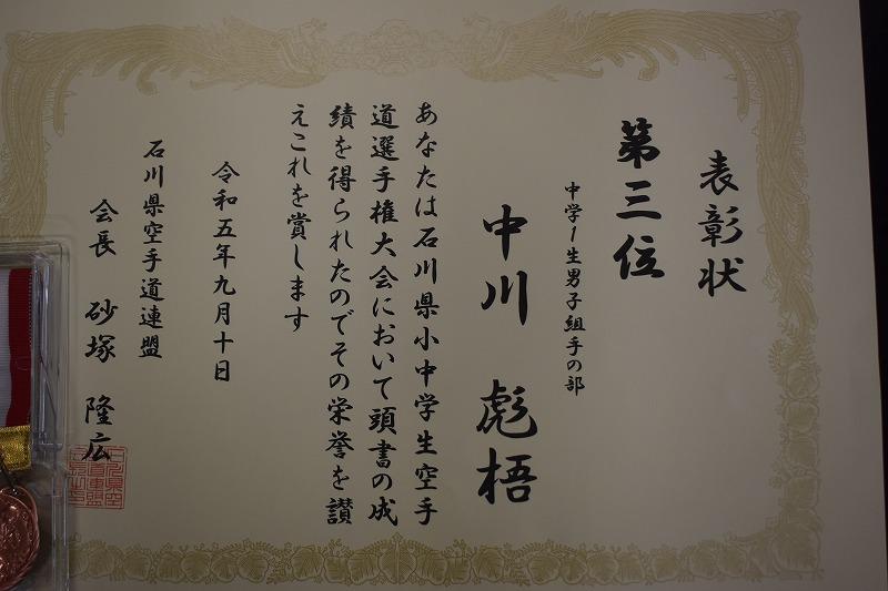 また、表彰状の写真はありませんが、中学2、3年生男子組手の部で寺西孟虎さん(3年)が優勝しています。おめでとうございます。