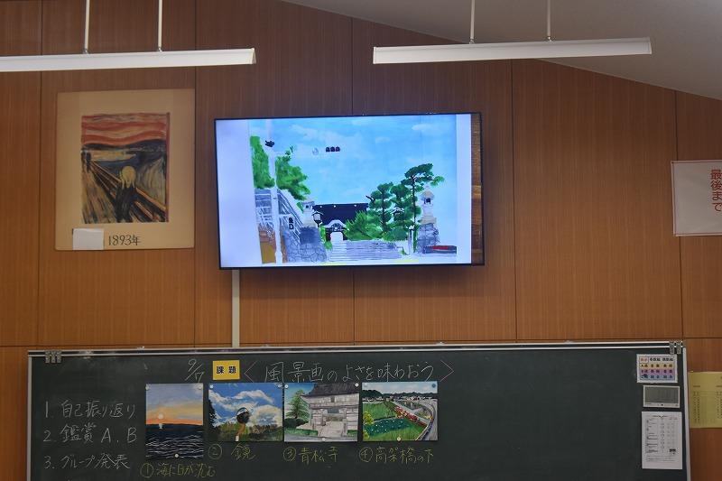 2年生、山下先生の美術の授業。2年生の夏休み提出課題は「風景画」。2組の生徒の皆さんの作品を先生が紹介。紹介された風景画を見るたびに、「おおー!」「すごい!」「じょうず!」などの声が、みんなから聞こえてきました。他の人の作品に素直に感心し、自然と言葉が出てくる、素敵な場面でした。みんなで、いろいろな場面でその人その人の素敵なところを見て、見つけて、思い切って声に出していきましょうね。もっとすてきな仲間たちになれますよ。